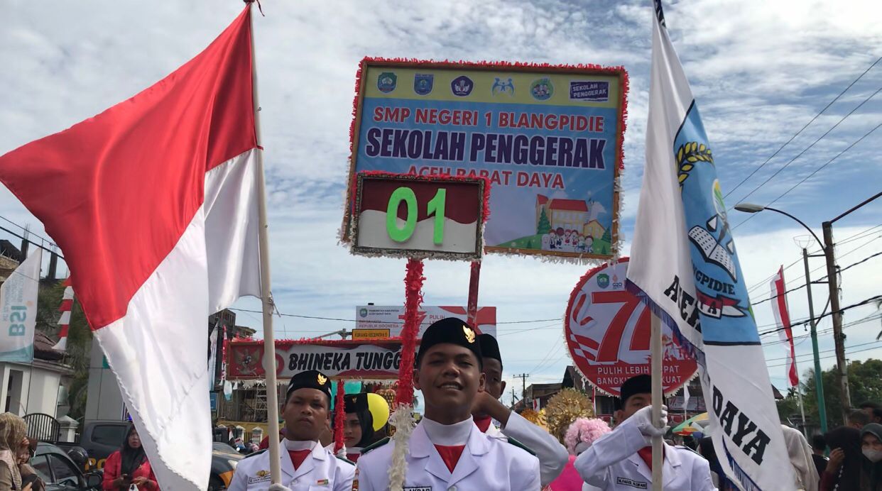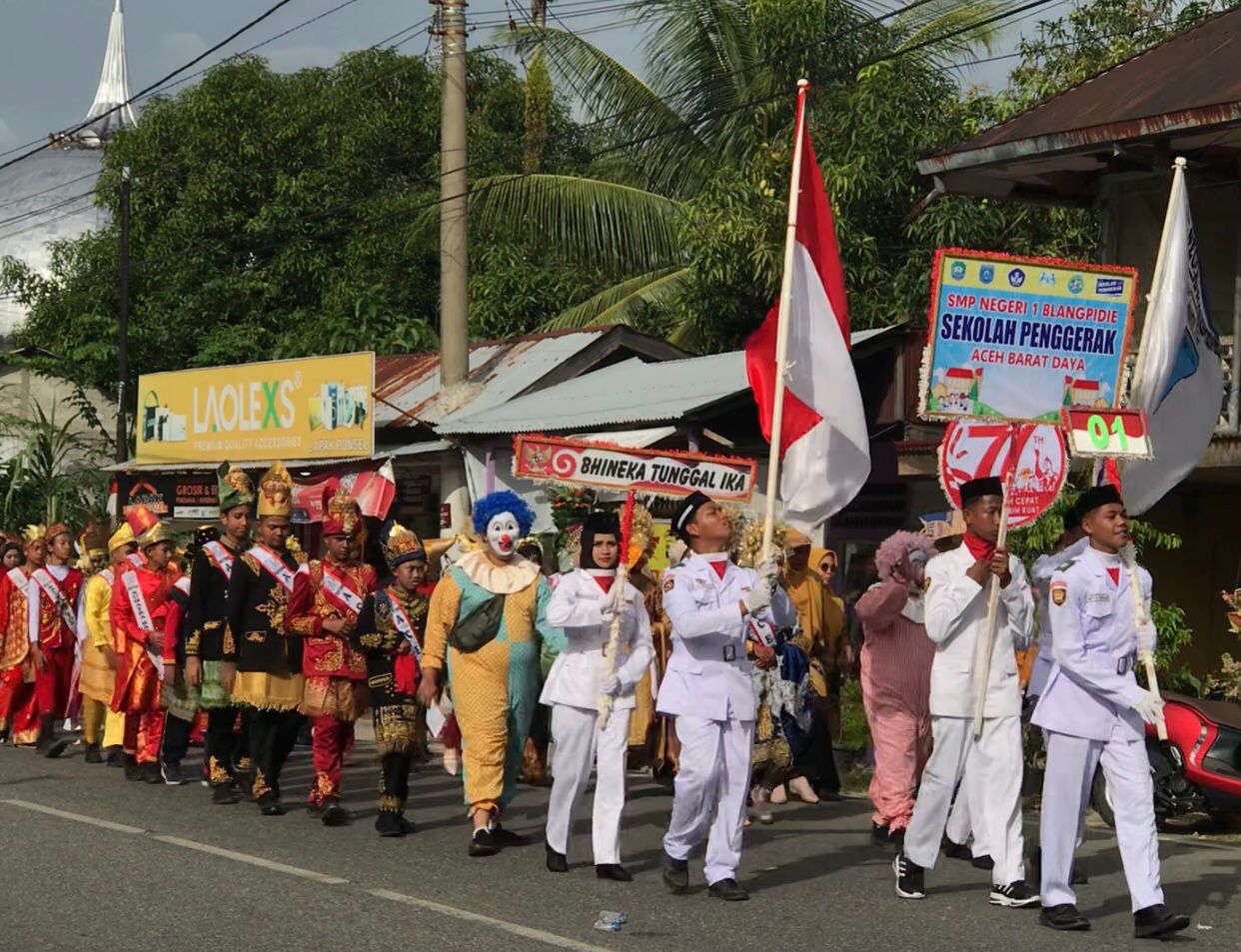 Kamis, 18 Agustus 2022 Pemerintah Aceh Barat Daya mengadakan lomba karnaval se-TK, SD/MI, SMP/MTsN, SMA/MA dalam rangka memeriahkan hari Kemerdekaan Indonesia ke-77. Acara karnaval tersebut di pimpin langsung oleh PJ Bupati Aceh Barat Daya, Bapak H. Darmansyah, S.Pd., M.M . Seluruh sekolah yang berada di kecamatan Blangpidie-Jeumpa-Susoh berkumpul di lapangan kebanggaan rakyat Abdya, lapangan Persada. Seluruh sekolah sudah berhadir tepat pada Pukul 14:00 dan berbaris rapi menunggu giliran untuk berjalan. Suasana yang padat dan ramai tidak mematahkan semangat para peserta karnaval khususnya siswa/i SMPN 1 Blangpidie di dalam asuhan Bapak Muhammad Wahyu, S.Pd.I, yang sangat antusias ingin menunjukkan pakaian-pakaian daerah yang mereka kenakan kepada seluruh masyarakat Aceh Barat Daya yang menyaksikan. Selain pakaian daerah, SMPN 1 Blangpidie juga menghadirkan pakaian profesi-profesi yang ada di Indonesia. Terlihat dari tampak depan, para siswa membawa Bendera Merah Putih dan beberapa pamplet dengan tema kebangsaan serta memakai baju putih atau baju Paskibra dengan sangat gagah, disusul oleh Para Badut yang sangat lucu guna untuk menghibur seluruh penonton masyarakat Abdya. Seluruh proses karnaval ini tidak terlepas dari kekompakan seluruh Guru yang ada di SMPN 1 Blangpidie dalam memeriahkan Hari Kemerdekaan Bangsa Indonesia ke-77 ini.