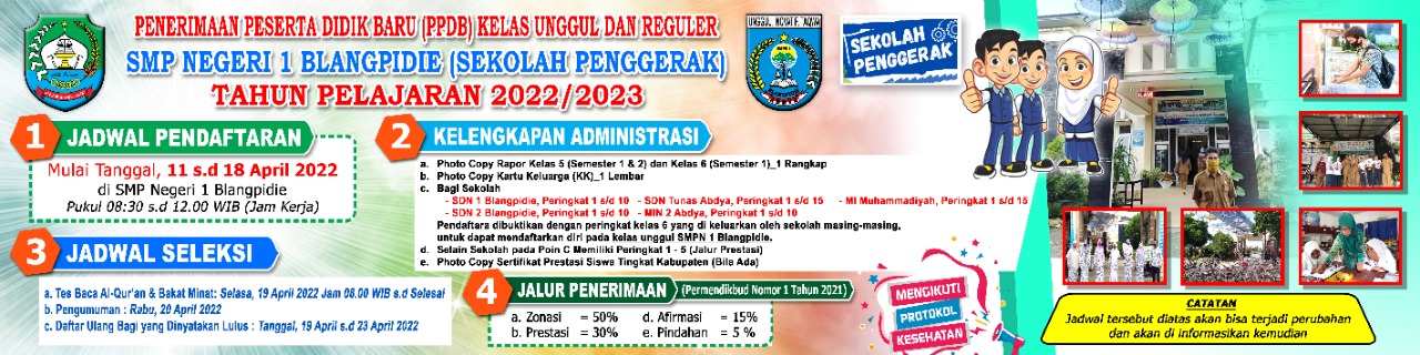 SMP Negeri 1 Blangpidie (SEKOLAH PENGGERAK) kembali membuka PENERIMAAN PESERTA DIDIK BARU (PPDB) KELAS UNGGUL DAN REGULER TAHUN PELAJARAN 2022/2023.